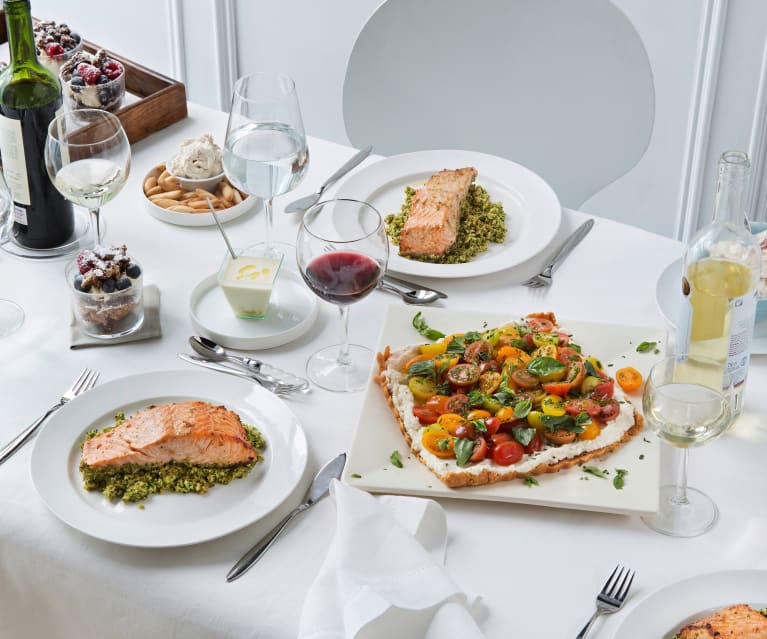 - Sirva el Dip cremoso de jamón y el Ajoblanco de avellana con compota de manzana de aperitivo. La Tarta de tres quesos y tomates cherry de entrante. El Salmón a la naranja con cuscús de brócoli de plato principal y el Brownie con crema de mascarpone y frutos rojos de postre.