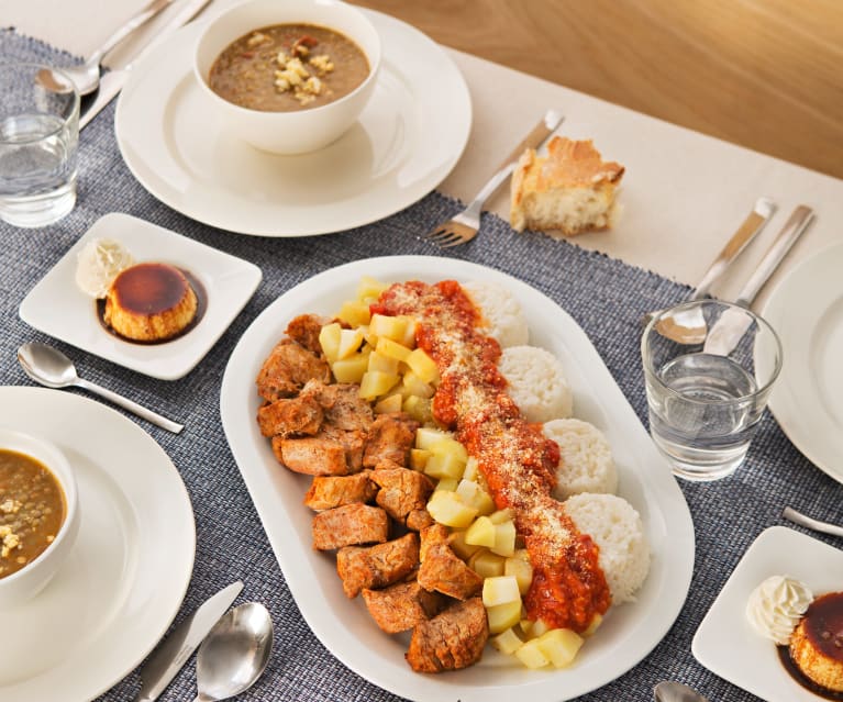 - Al cocinar algo que genere vapor, como una sopa, una salsa o un estofado, puedes poner ingredientes en el cestillo o el Varoma para cocinarlos o volver a calentarlos al mismo tiempo. Cookidoo® dispone de varias recetas para cocinar múltiples platos a la vez, incluido el postre. Una cena al vapor es fácil de limpiar, así que no tendrás que preocuparte por las ollas sucias ni las manchas de grasa.