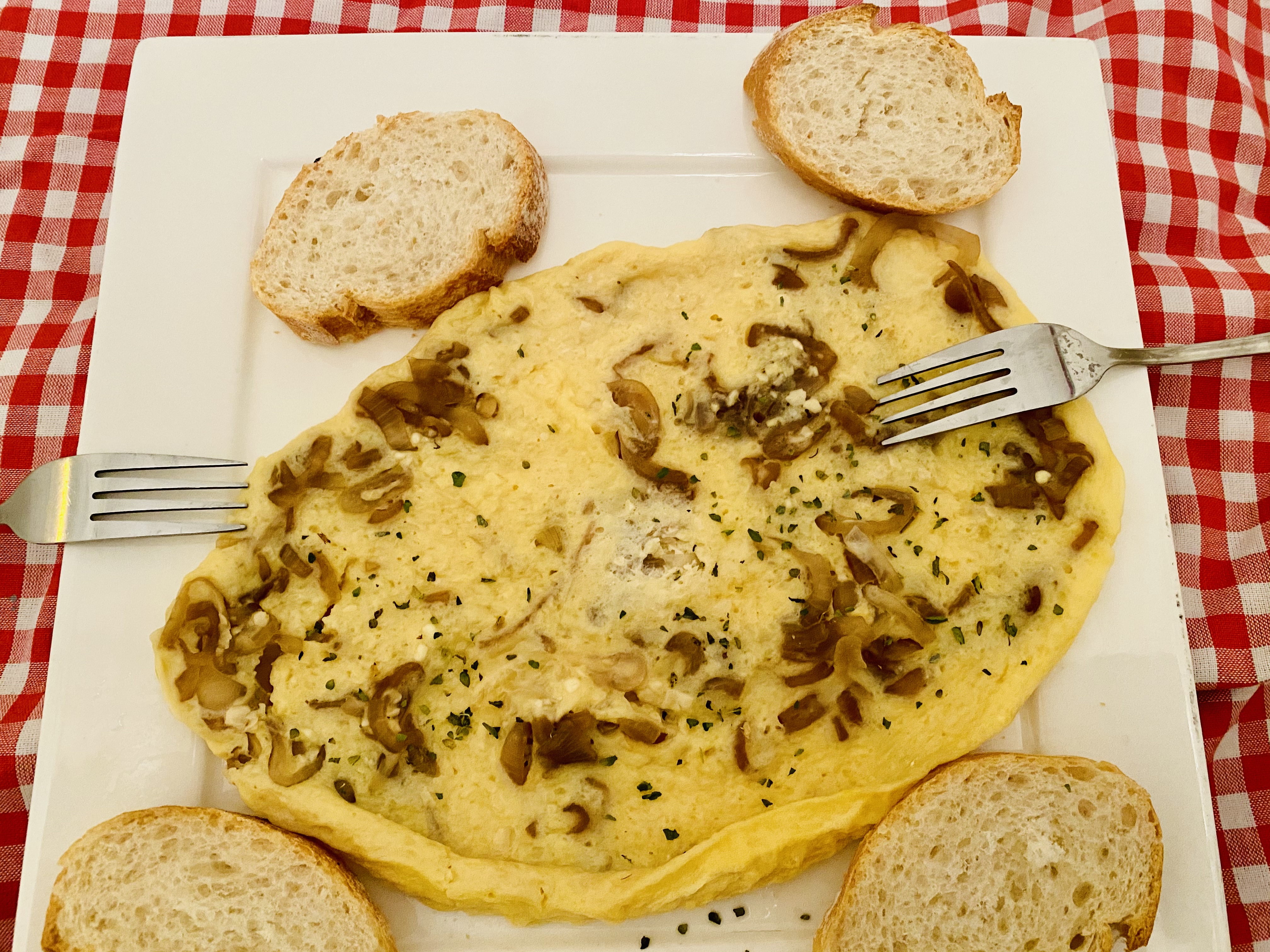 FRITTATA AL VAPOR CON QUESO DE CABRA Y CEBOLLA ROJA CARAMELIZADA