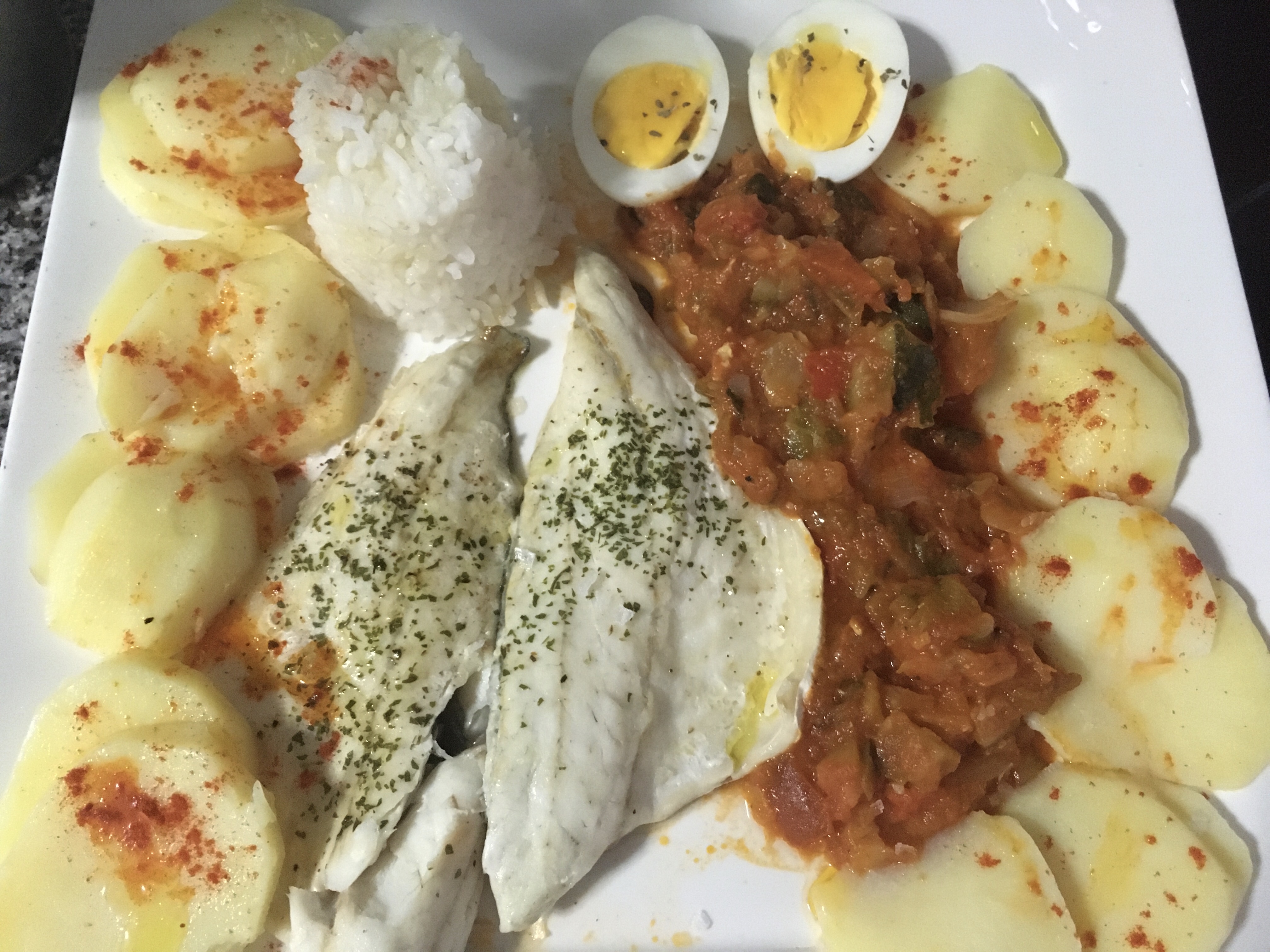 Pisto con Lubina Patatas y huevos