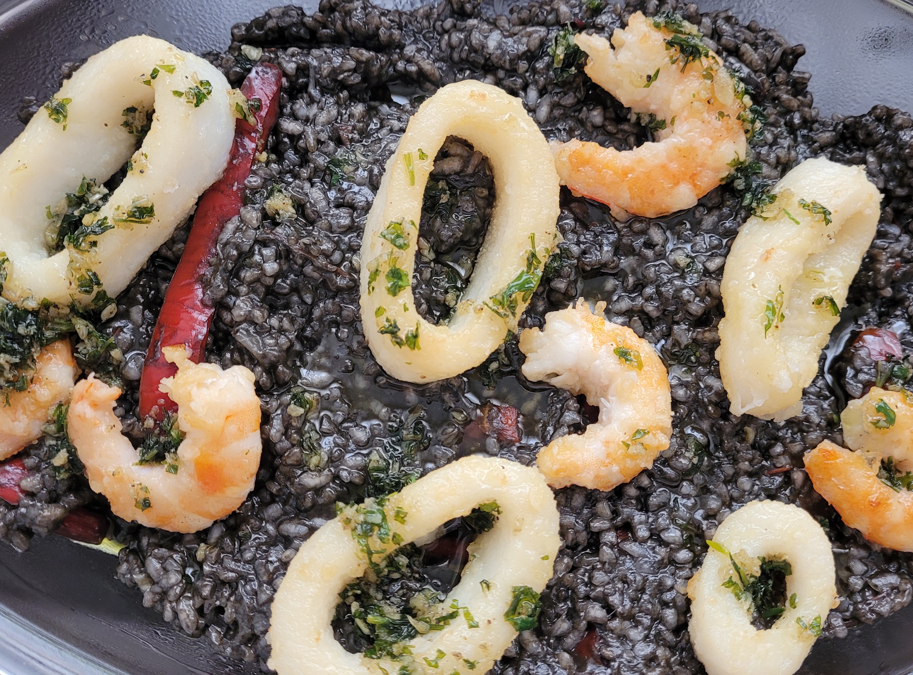 Arroz negro con calamares y gambones fritos