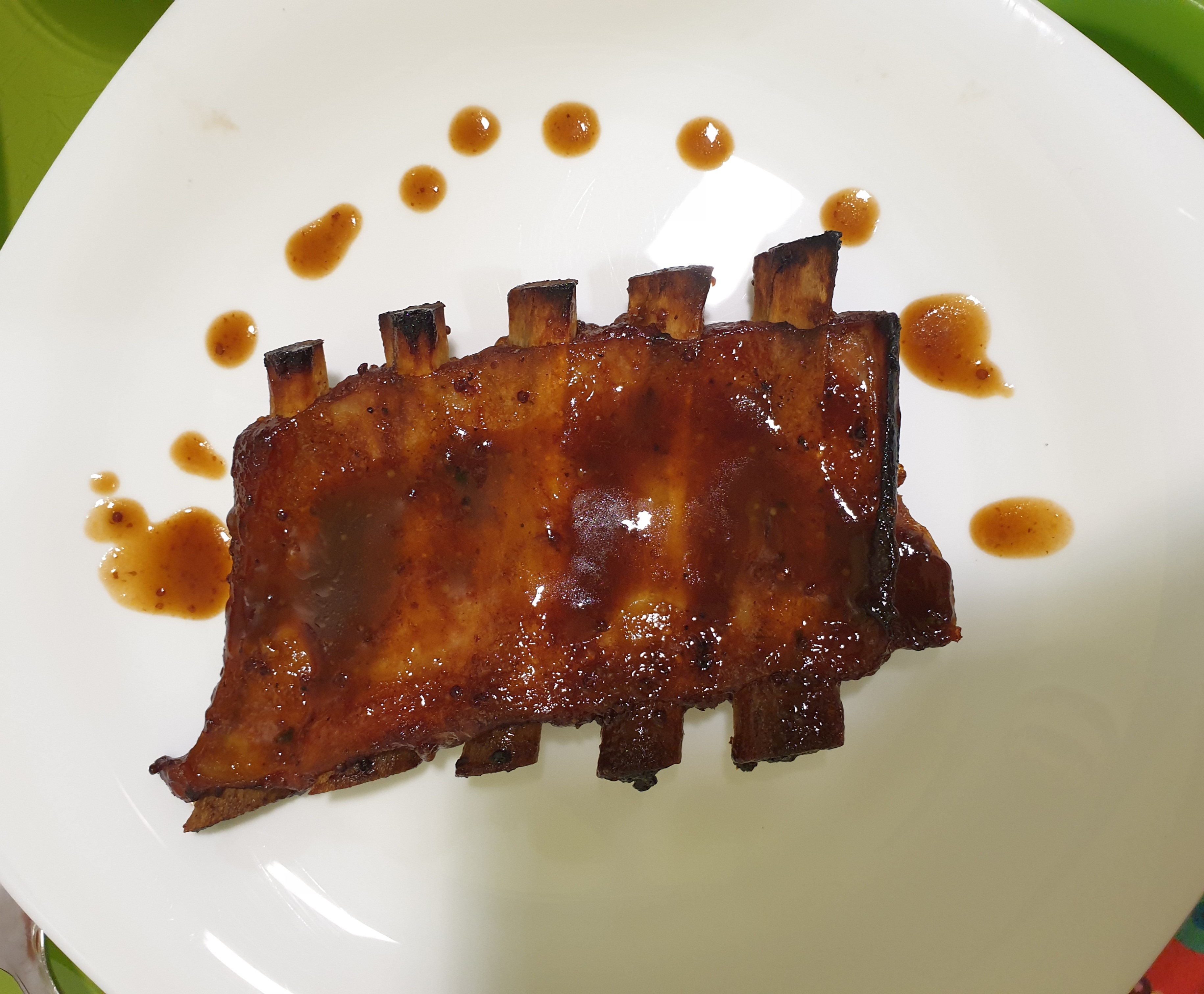 - Hornee durante 15 minutos por cada lado (200ºC), pintando de tanto en tanto las costillas con salsa hasta que estén bien caramelizadas. Sirva inmediatamente con la salsa de la bandeja y la salsa reservada caliente en una salsera.