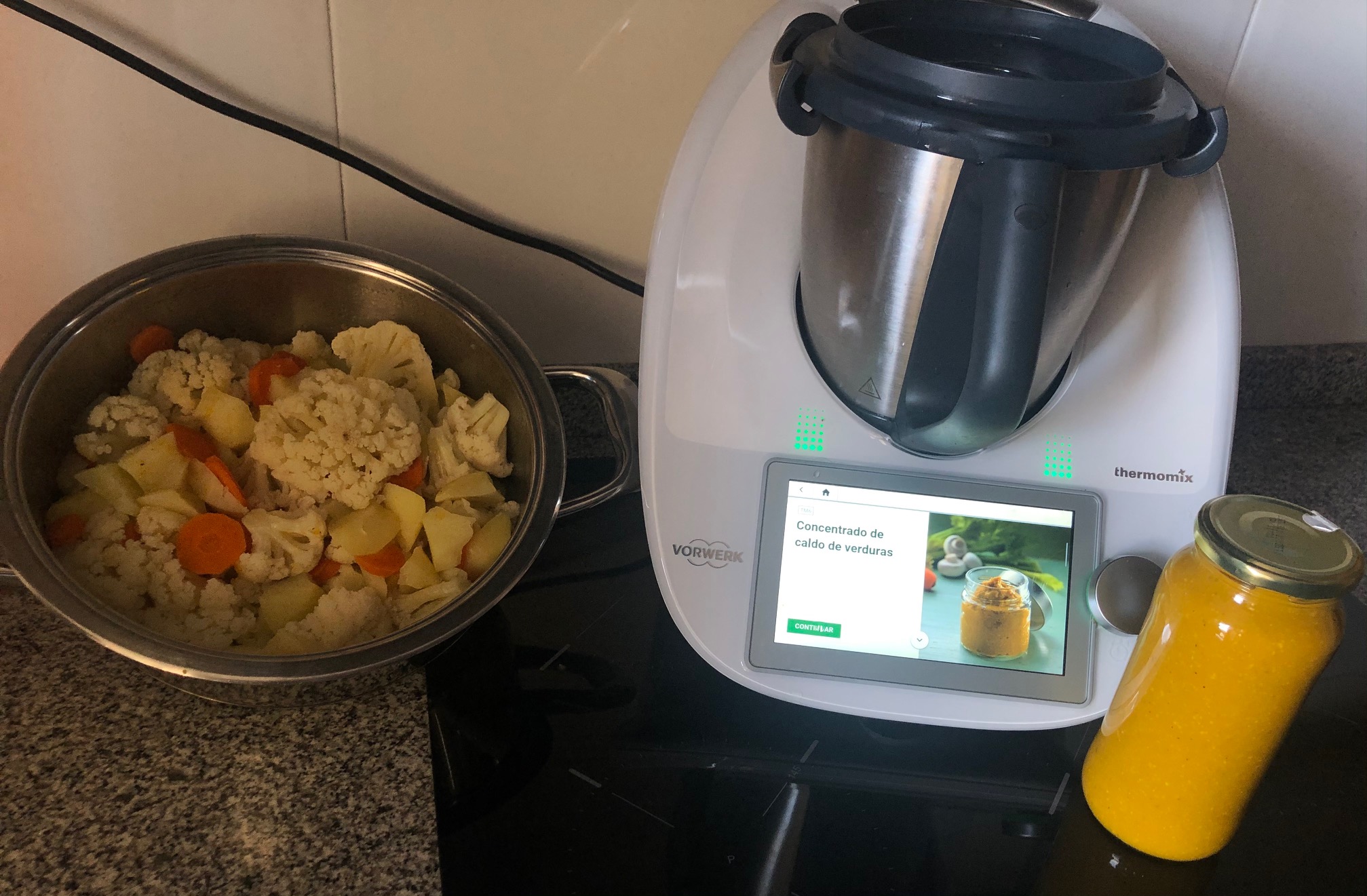 Aprovechando los 35 minutos de cocinado, ahorrando tiempo y energía, he preparado la comida, una deliciosa coliflor de huerto con patatas y zanahoria.